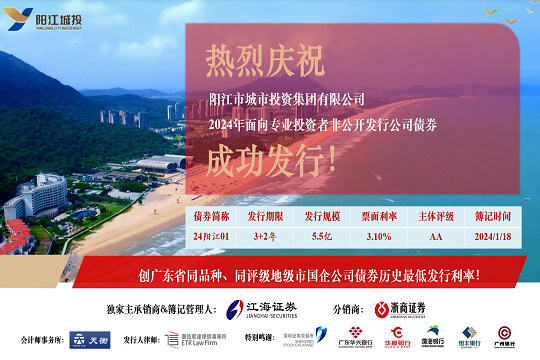 2024年1月19日,市城投集團(tuán)在深圳證券交易所成功發(fā)行“陽江市城市投資集團(tuán)有限公司2024年面向?qū)I(yè)投資者非公開發(fā)行公司債券”。本期債券發(fā)行規(guī)模為5.5億元,期限為5(3+2)年,票面利率3.10%,全場認(rèn)購倍數(shù)超過4.8倍,是...